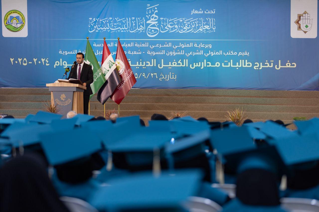 نظّمت شعبة مدارس الكفيل الدينية النسوية، التابعة لمكتب المتولي الشرعي في العتبة العباسية المقدسة، حفل تخرّج طالباتها للعامين 2024–2025، وذلك تحت شعار (بالعلم نرتقي وعلى نهج أهل البيت -عليهم السلام- نسير)، بحضور عدد من الشخصيات الدينية والإدارية في العتبة المقدسة، وجمع من الطالبات المحتفى بهنّ وعوائلهن. تخللت فعاليات الحفل استقبال سماحة المتولي الشرعي السيد أحمد الصافي (دام عزّه)، تلاها قراءة من الذكر الحكيم، ثم النشيد الوطني ونشيد الإباء، وقراءة سورة الفاتحة على أرواح شهداء العراق. بعد ذلك، ألقى المتولي الشرعي للعتبة العباسية المقدسة سماحة العلامة السيد أحمد الصافي (دام عزّه) كلمة مؤثرة. ثم ألقت السيدة بشرى عبد الحسين، مديرة مدرستي "أم البنين" و"آمنة بنت وهب" (عليهما السلام)، كلمة بالنيابة عن إدارات مدارس الكفيل الدينية النسوية، أكدت فيها أنّ المرأة المؤمنة تمثل الحصن المنيع في مواجهة حملات التشكيك والانحراف. تلا ذلك عرض فيلم وثائقي عن أنشطة شعبة مدارس الكفيل، من إنتاج شعبة إذاعة الكفيل النسوية، تضمن استعراضًا للمناهج والبرامج والأنشطة الميدانية والخدمية والدعوية التي تقودها الخريجات في المناسبات الدينية. وفي كلمة مؤثرة ألقتها إحدى الخريجات، استعرضت فيها تجربتها الشخصية التي بدأت من ظروف قاسية عاشتها في أرياف الأهوار، إلى أن منّ الله عليها بالالتحاق بمدارس الكفيل، مشيدةً بالدعم المادي والمعنوي الذي وفرته العتبة العباسية المقدسة طيلة سنوات دراستها. وشهد الحفل فقرة تكريم إدارات مدارس الكفيل والطالبات الأوائل، حيث تناوب على التكريم كلّ من المتولي الشرعي للعتبة العباسية المقدسة سماحة العلامة السيد أحمد الصافي، والأمين العام السيد مصطفى مرتضى آل ضياء الدين، ونائب الأمين العام المهندس عباس موسى أحمد، وعضو مجلس الإدارة السيد محمد الأشيقر، ومدير مكتب المتولي الشرعي السيد جواد الحسناوي. واختتمت الفعاليات بفقرة التوجه إلى زيارة مرقدي الإمام الحسين وأخيه أبي الفضل العباس (عليهما السلام)، ويُعدّ هذا الحفل تتويجًا لجهودٍ متواصلة تبذلها العتبة العباسية المقدسة في سبيل بناء جيلٍ واعٍ ومتفقه، قادر على مواجهة التحديات، والإسهام الفعّال في خدمة الدين والمجتمع، تحت راية أهل البيت (عليهم السلام).
